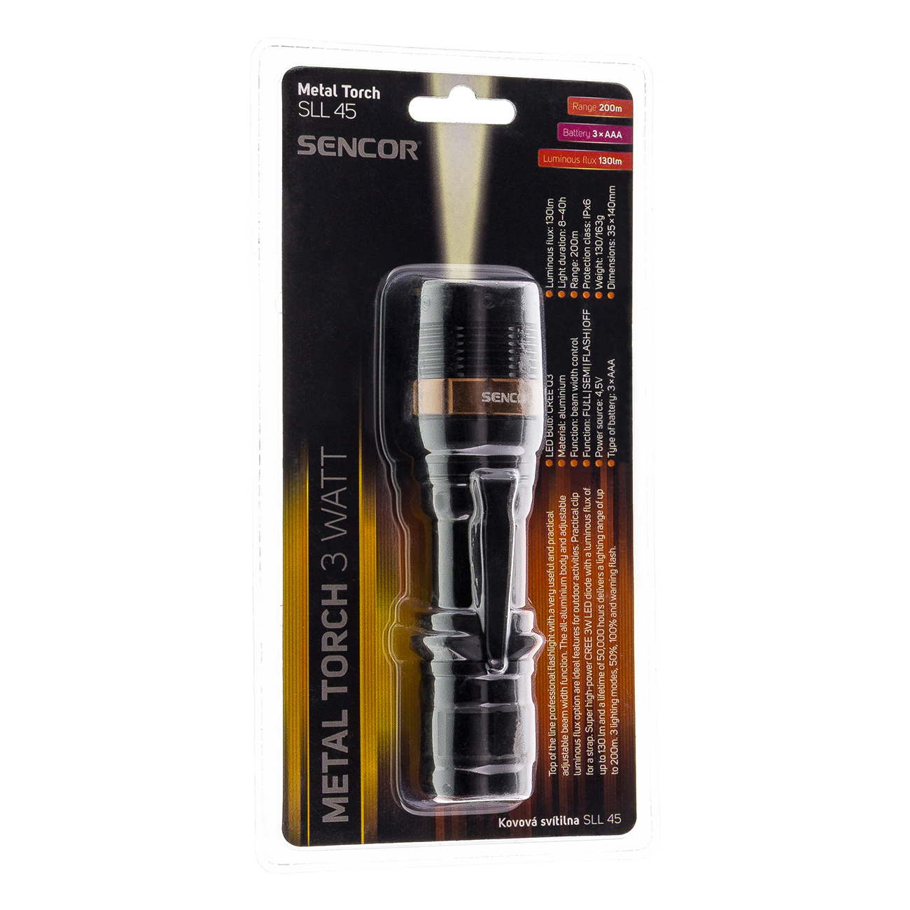 Изключително мощния CREE 3W LED диод със светлинен поток от 130 lm и дълготрайност от 50 000 часа осветява до 200m.