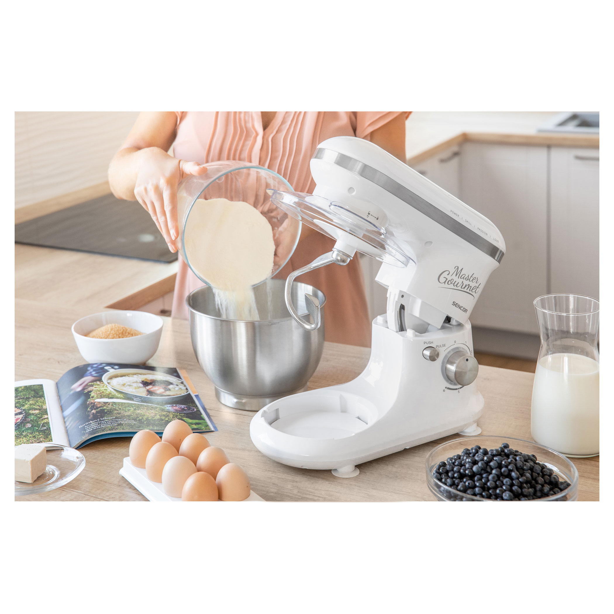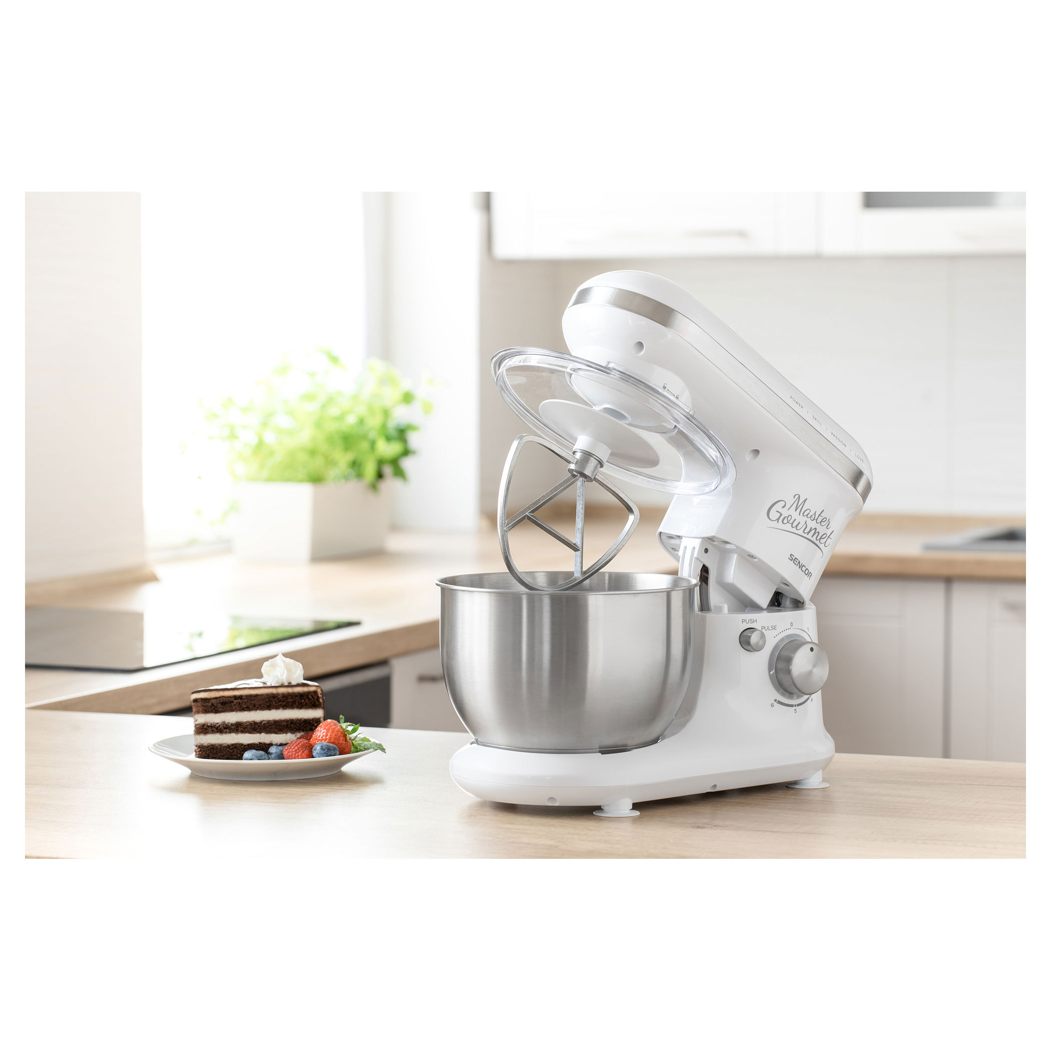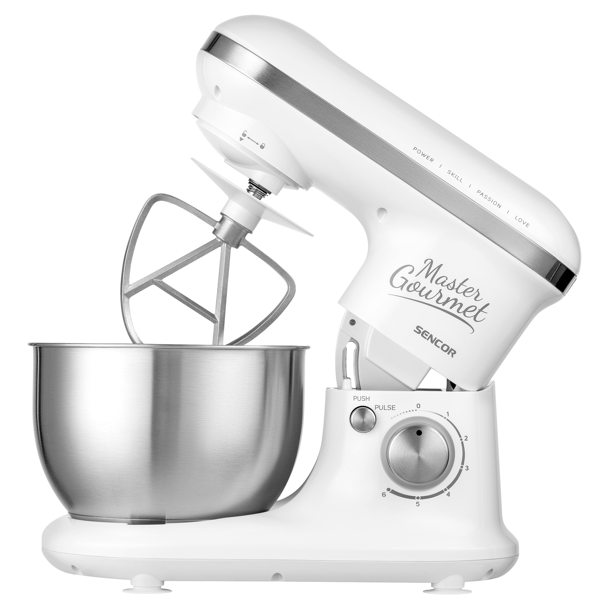 4 подвижни приставки: бъркалка за тесто (за по-тежко тесто с мая), А-образни бъркалки (за сметана и леко тесто без мая), голяма бъркалка (за сметана, белтъци, и др.), протектор