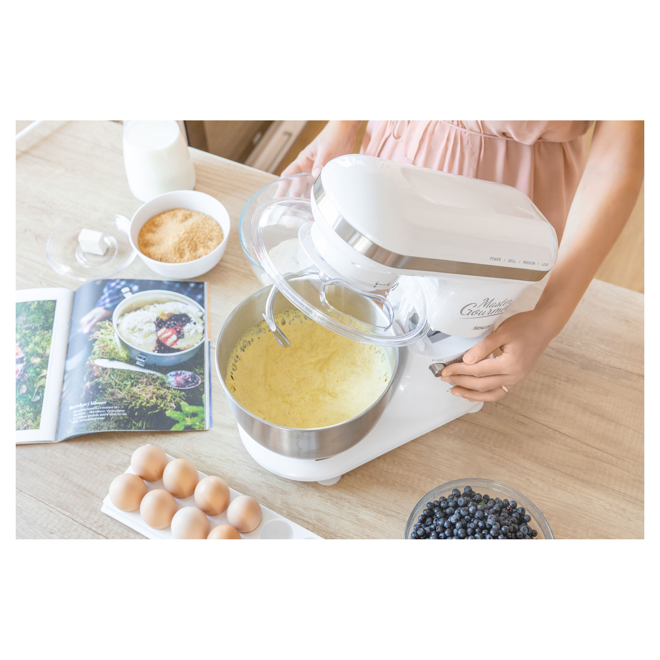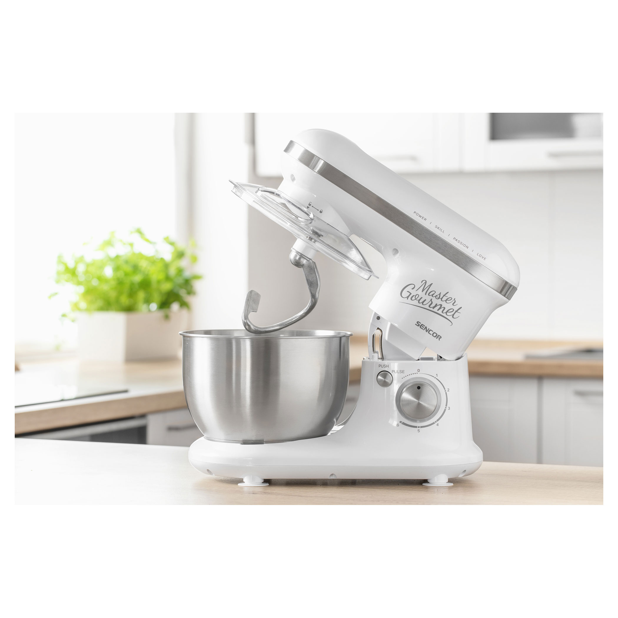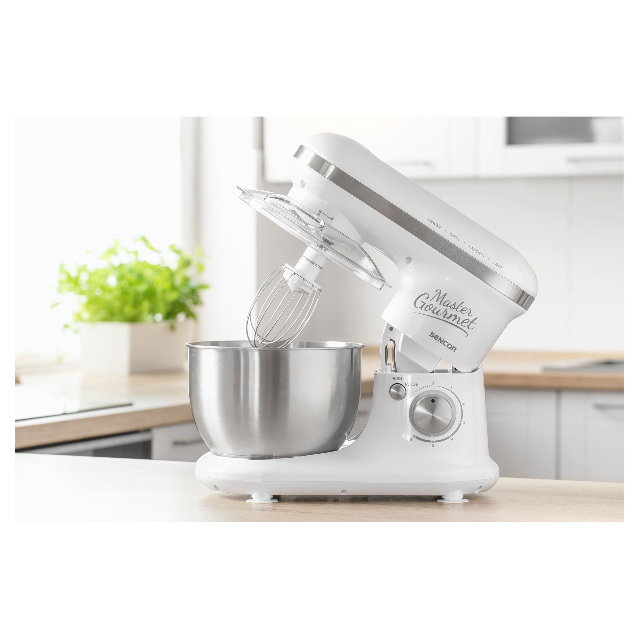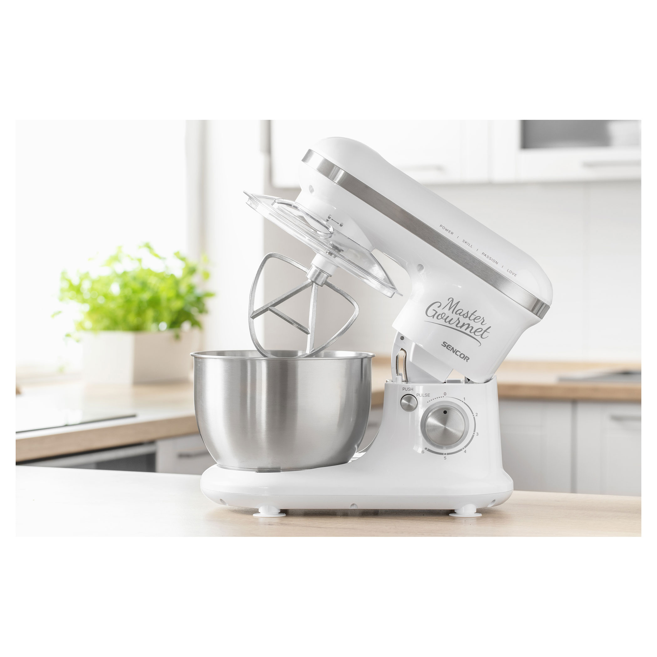4 подвижни приставки: бъркалка за тесто (за по-тежко тесто с мая), А-образни бъркалки (за сметана и леко тесто без мая), голяма бъркалка (за сметана, белтъци, и др.), протектор