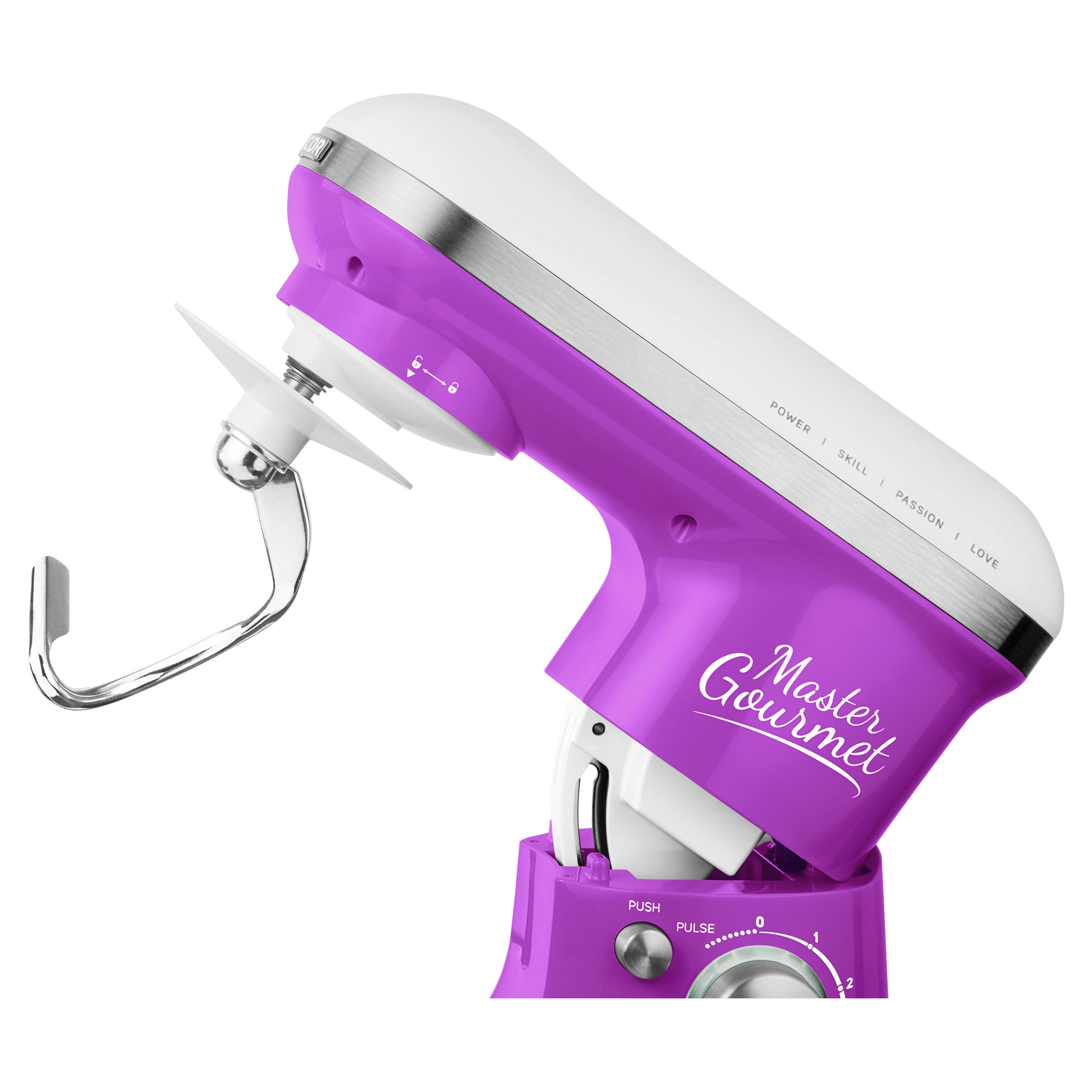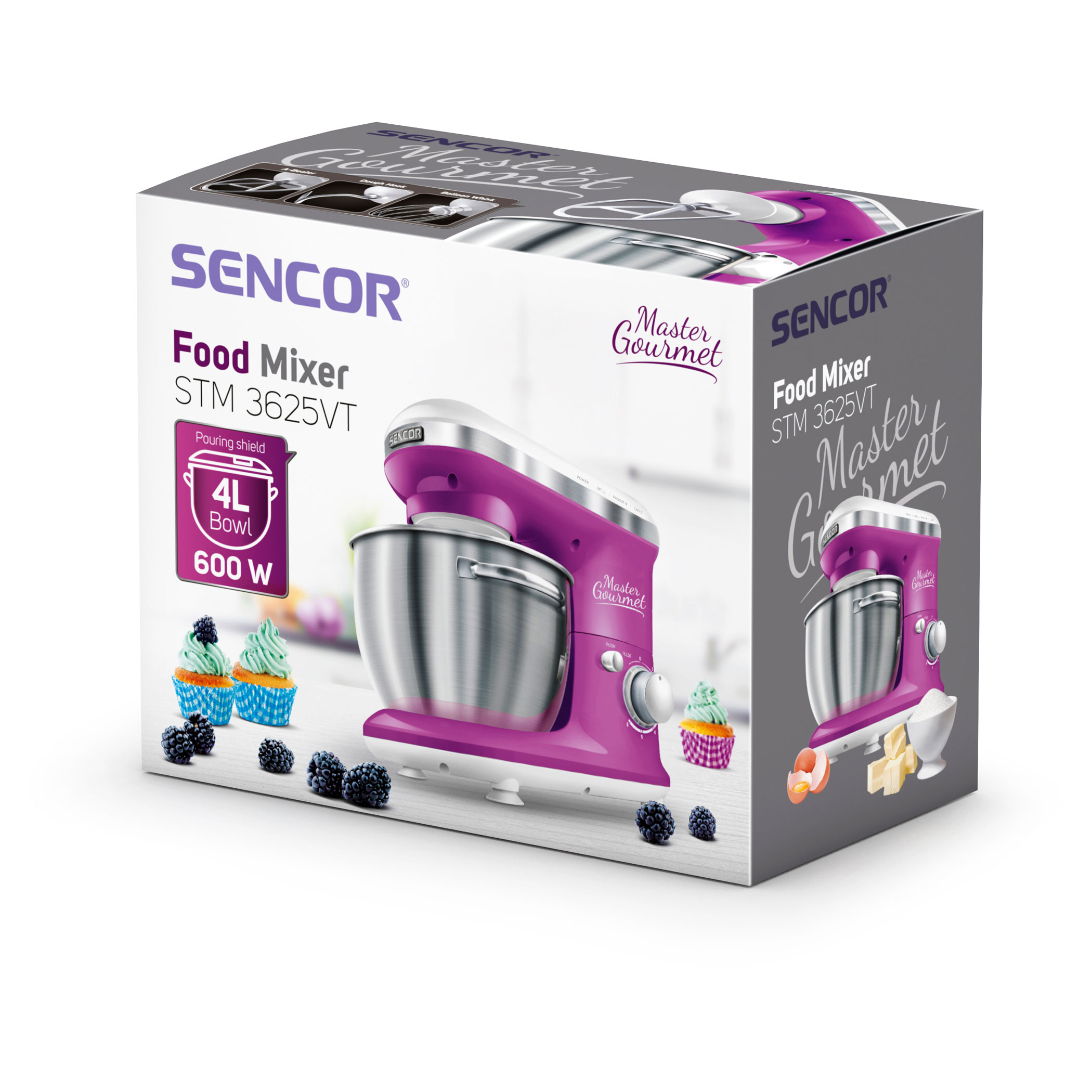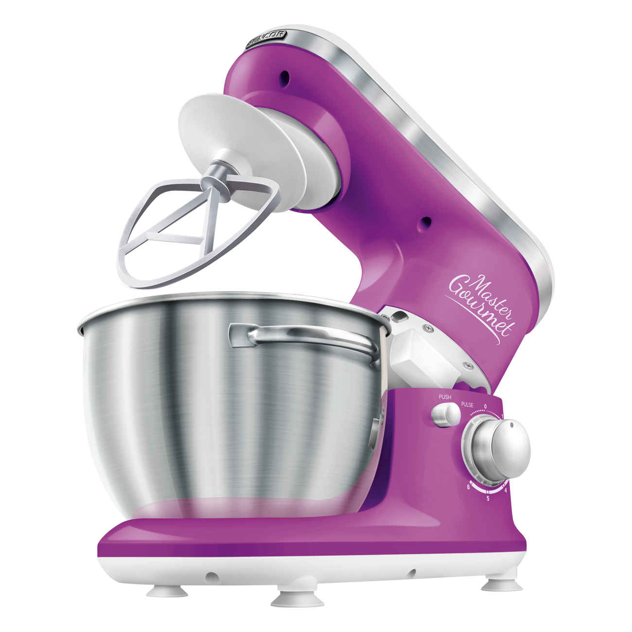 4 подвижни приставки: бъркалка за тесто (за по-тежко тесто с мая), А-образни бъркалки (за сметана и леко тесто без мая), голяма бъркалка (за сметана, белтъци, и др.), протектор